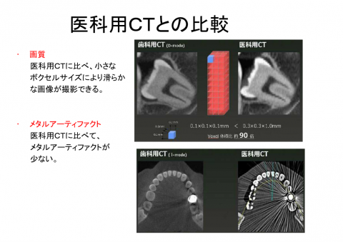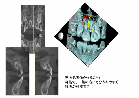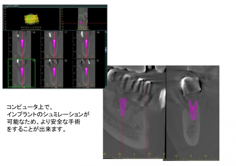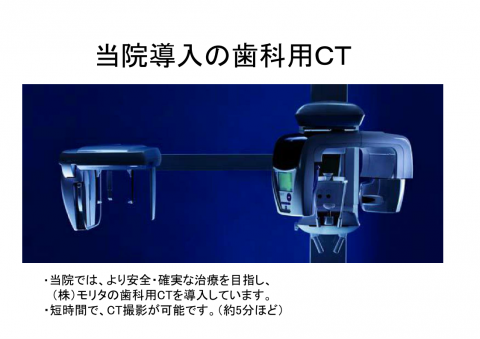 当院で導入している歯科用CTとその効果をご紹介します。 当院では、より安全確実な治療を目指し、(株)モリタの歯科用CTを導入しています。短時間でCT撮影が可能です。(約5分ほど) 通常のレントゲンでは判断が難しい、一本、一本の根の状態がはっきり分かります。 三次元画像を作ることも可能で、一般の方にも分かりやすく説明が可能です。 コンピュータ上でインプラントのシミュレーションが可能なため、より安全な手術をすることが出来ます。